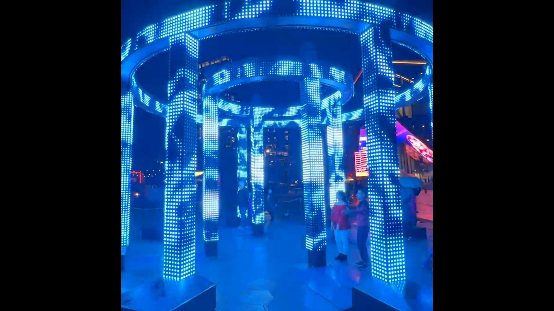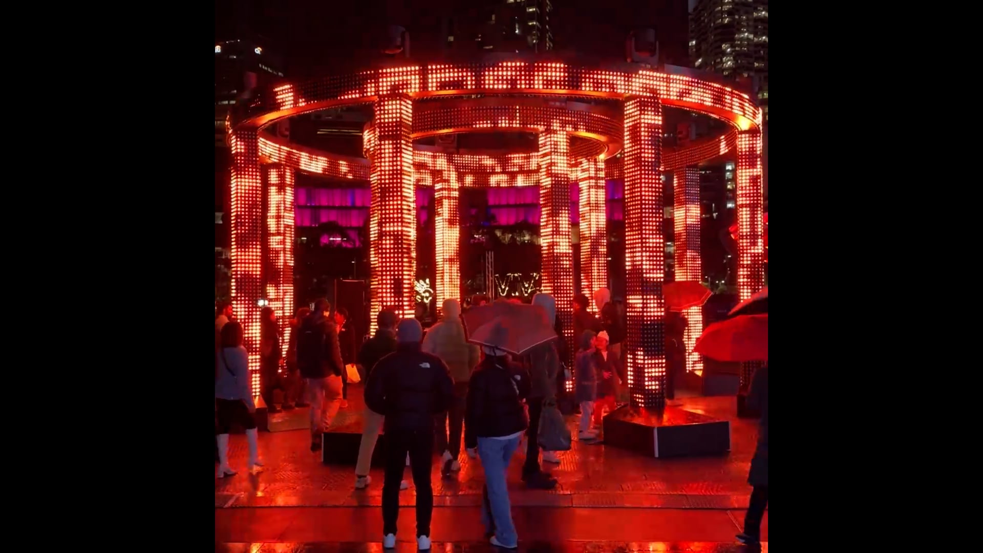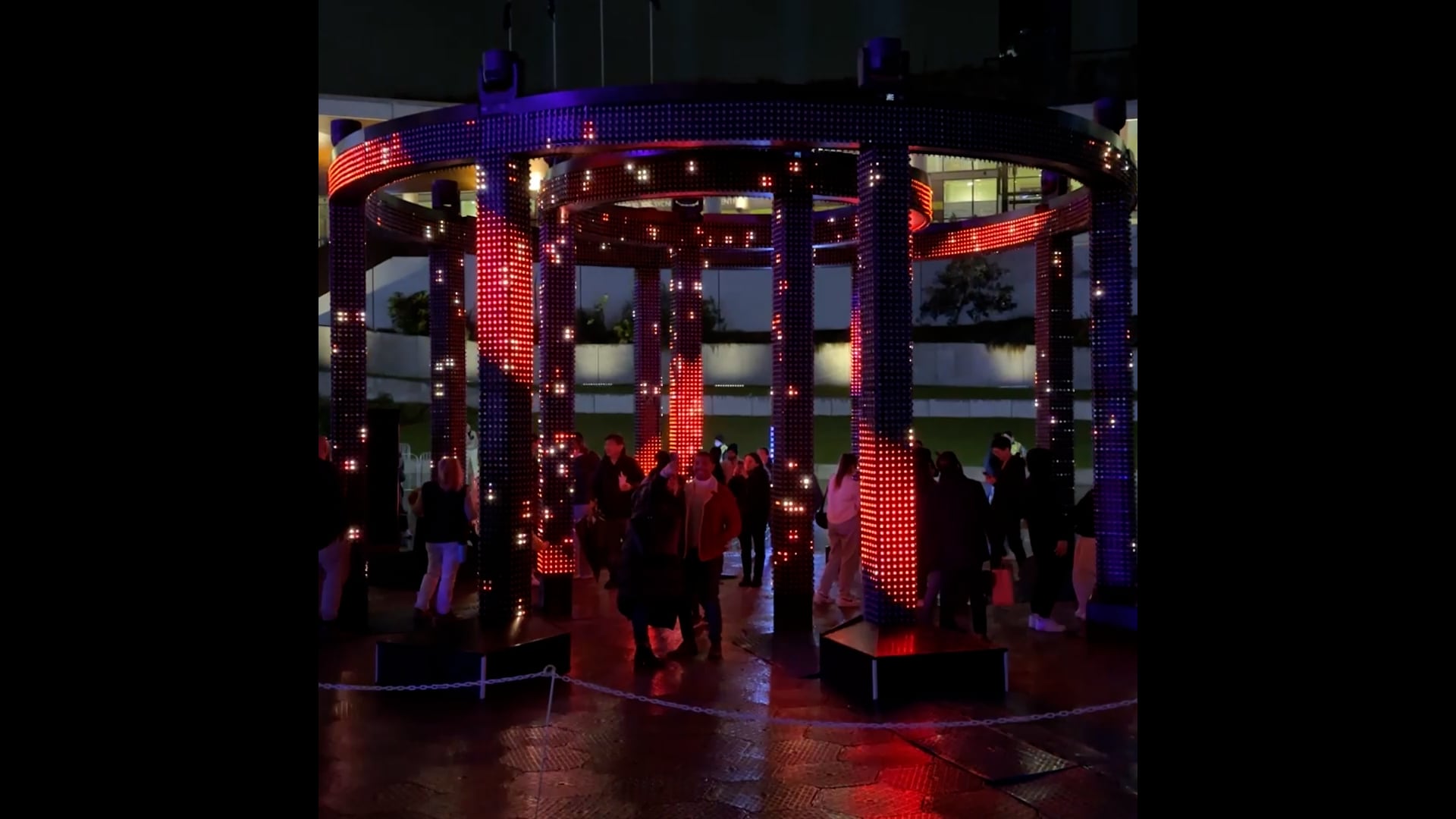 Constructed from hyper brilliant LED mesh woven across modular truss, the work animates geometric patterns inspired by ancient art, bridging past and present. A suite of audio visual sequences expresses the primitive elements of air, fire, wind, and water, drawing on ancient mythology to deepen the sense of ritual and connection.